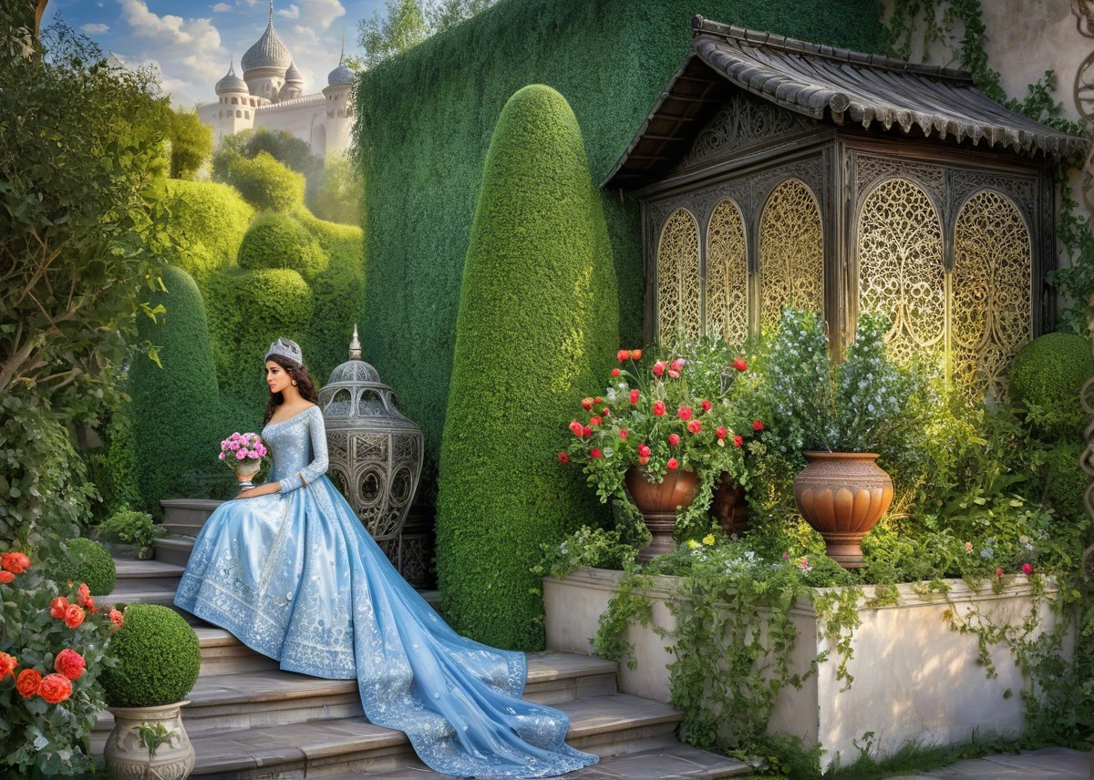 A woman in a stunning blue gown sits on steps surrounded by lush greenery and colourful flowers, with ornate vases nearby and a distant castle visible under a bright sky.