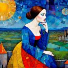 Prompt: female by Mick Haggerty: contoured vector art on a vignette, engraved in the Helft style. Blue enamel on porcelain. Bold strokes of thick, dark lacquer. Shiny sfumato effect, fantasy art with elements of mythological essence, beautiful linework, luminous, multi-layered eyes. Several transparent crystal-clear color shapes, primary colors are shades of blue, white, and beige. Very mystical, distinctly simplistic aesthetic, light-blue, metallic-honey, contouring outlines, watercolored book illustration, thinned paint, wet ink effects, indiecore illustration, contouring outlines, pastel color palette, stencil-style merging with streamlilne_moderne and street-art influences, complex lines, warped, simplified shapes for 3d effects, enclosed color shapes, delicate surrounding outlines, enlightened line-art details, plasticity 1.3, linework, contouring outlines by Freda People, merged styles of Robert Henri & Chaim Soutine, alcohol ink coloring by peter wileman, exaggerated stylization by Jean-Michel Basquiat, lighting by Raoul Dufy, abstract expressionism by Roberto Matta & Hope Gangloff, dyed by Igor Tuveri, hues by John Philip Falter, flabbergasting geometrical stylization 1.8, cracked paper texture, small brushstrokes with defined edges, tiny and lean lines, orphism, abstracted collage reminiscence, fusion of synthetic essence and abstract art, color palette inspired by William Bradley's and Carne Griffith's coloring style, included paper cuts,