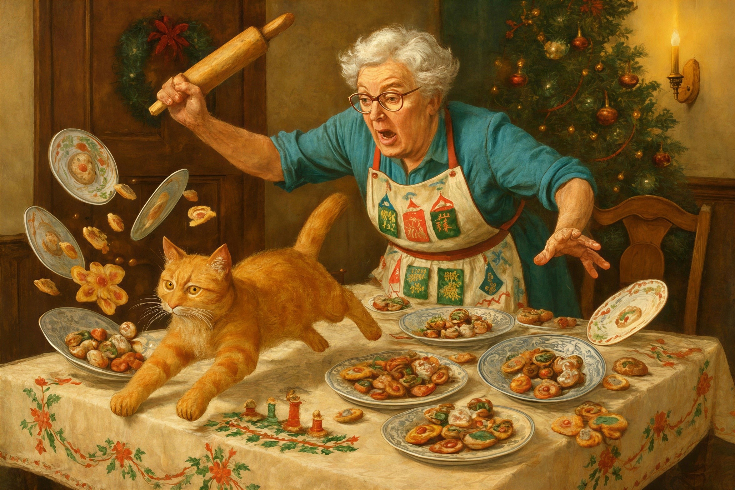 A high-quality painting of a domestic scene at a Christmas celebration, a domestic orange tabby cat on a tablecloth, running left, as a grandma with glasses and gray hair waves a rolling pin and yells, standing behind a table full of Christmas cookies during the holiday season. The table has a tablecloth with