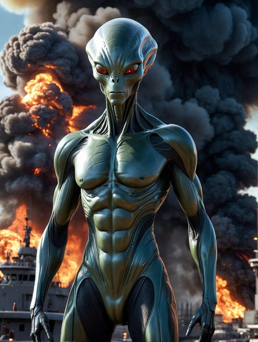 A futuristic alien figure with an elongated head and large, expressive eyes stands confidently in a surreal landscape, featuring towering rock formations and a glowing celestial backdrop.