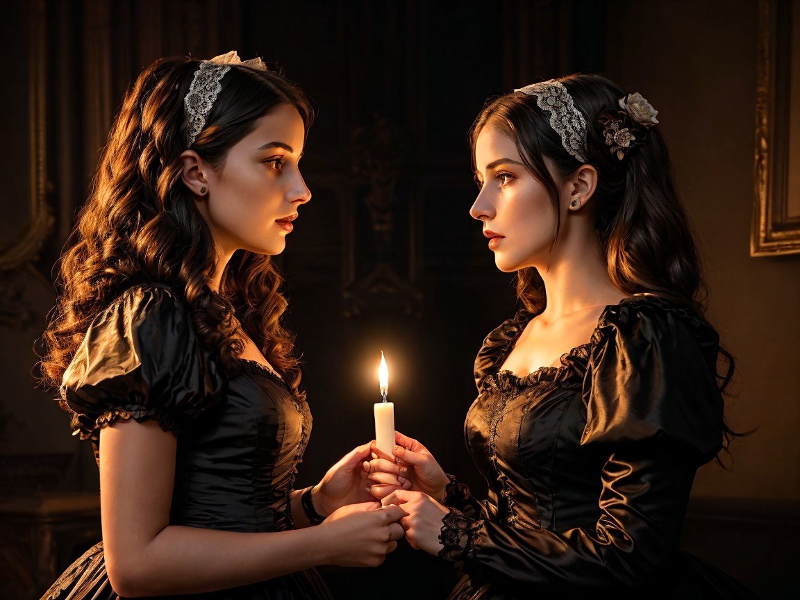 Two elegantly dressed women in vintage attire share a moment, illuminated by a soft candlelight. Their hairstyles are intricate, and the atmosphere is intimate and reflective.
