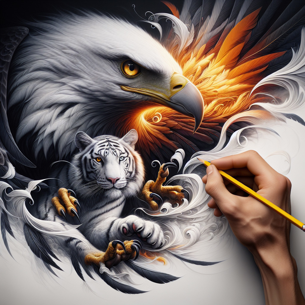A dramatic scene featuring two white tigers and a powerful eagle, with vibrant colors and dynamic lighting, captures a moment of tension as the animals engage in a fierce confrontation.