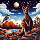 A vibrant, stylized scene features a kangaroo sitting by a river under a starry sky, with a kookaburra nearby and distant mountains, embodying the beauty of the Australian wilderness.