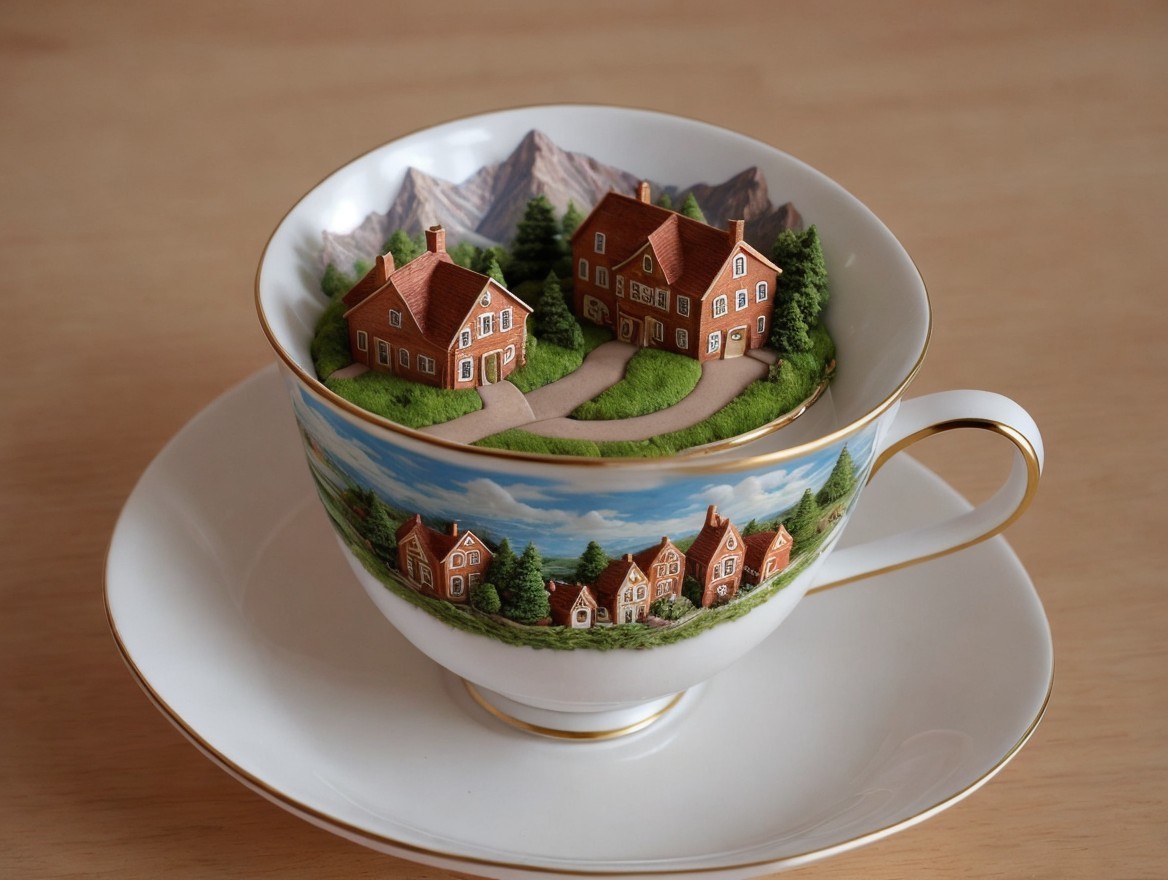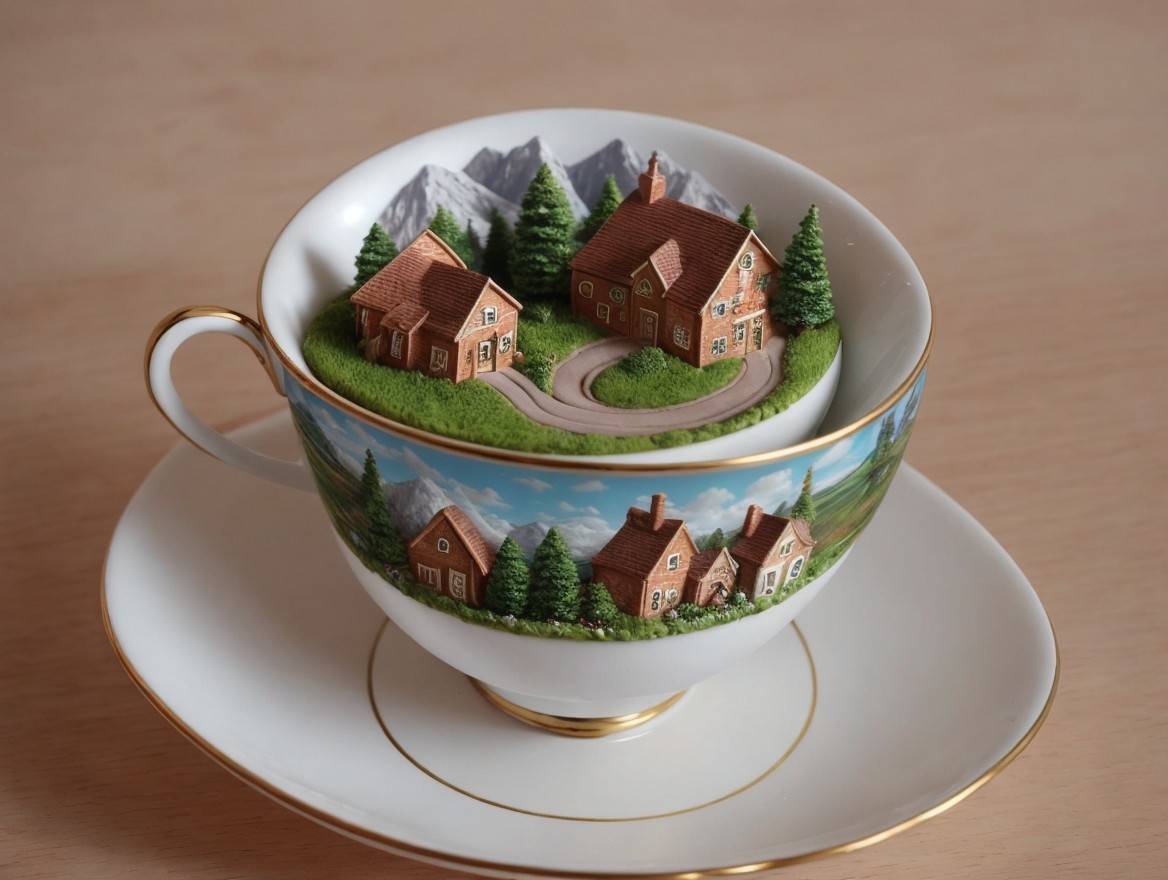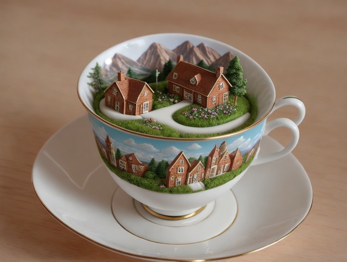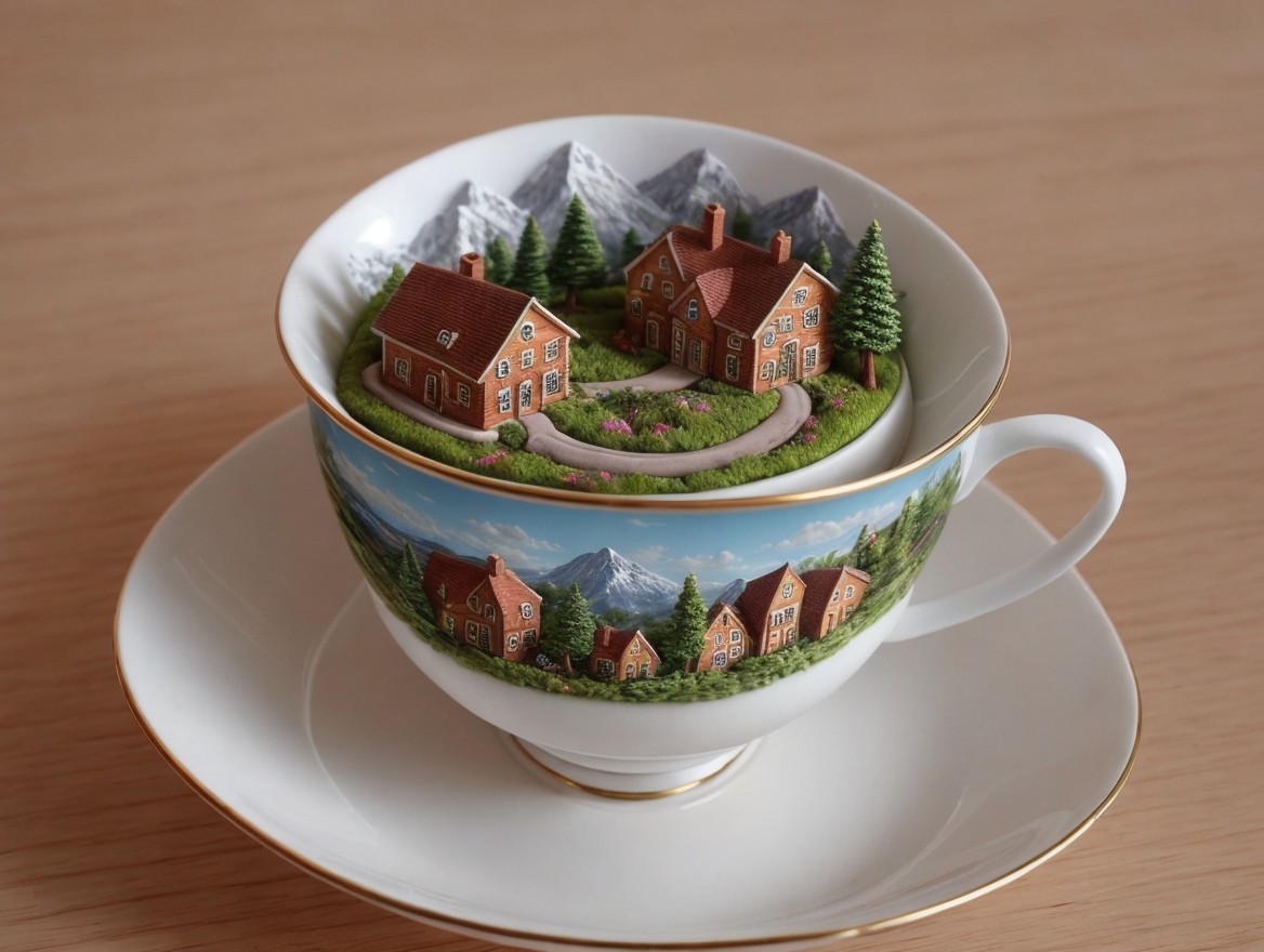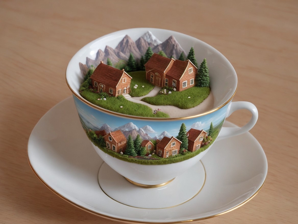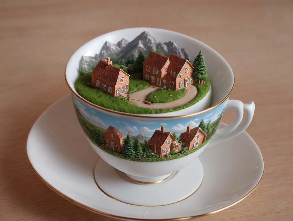 A whimsical teacup features a miniature village scene with houses, greenery, and mountains, all intricately crafted on a vibrant, detailed landscape inside the cup.