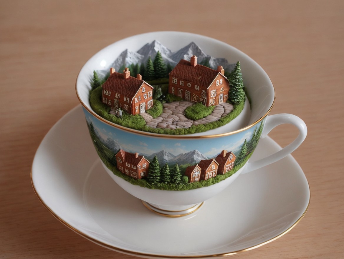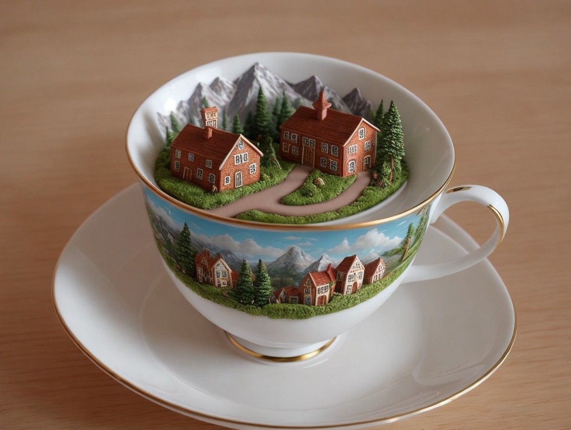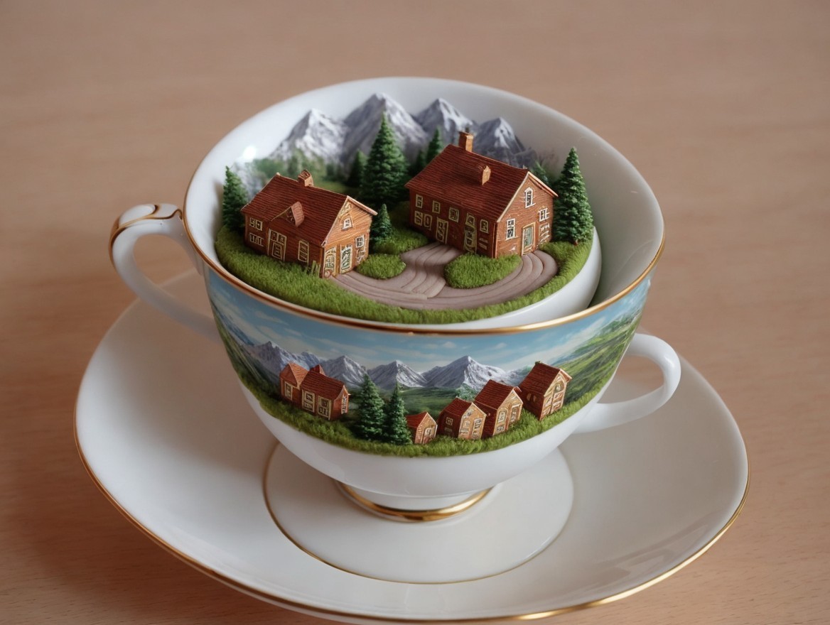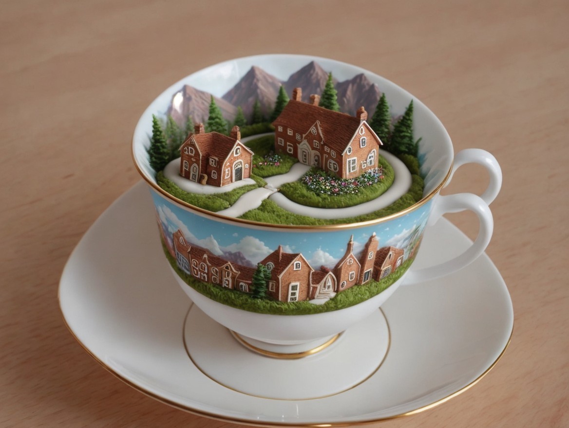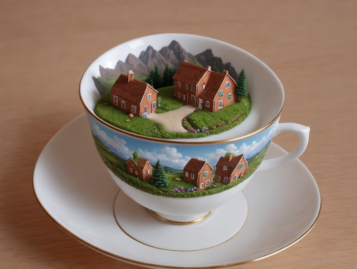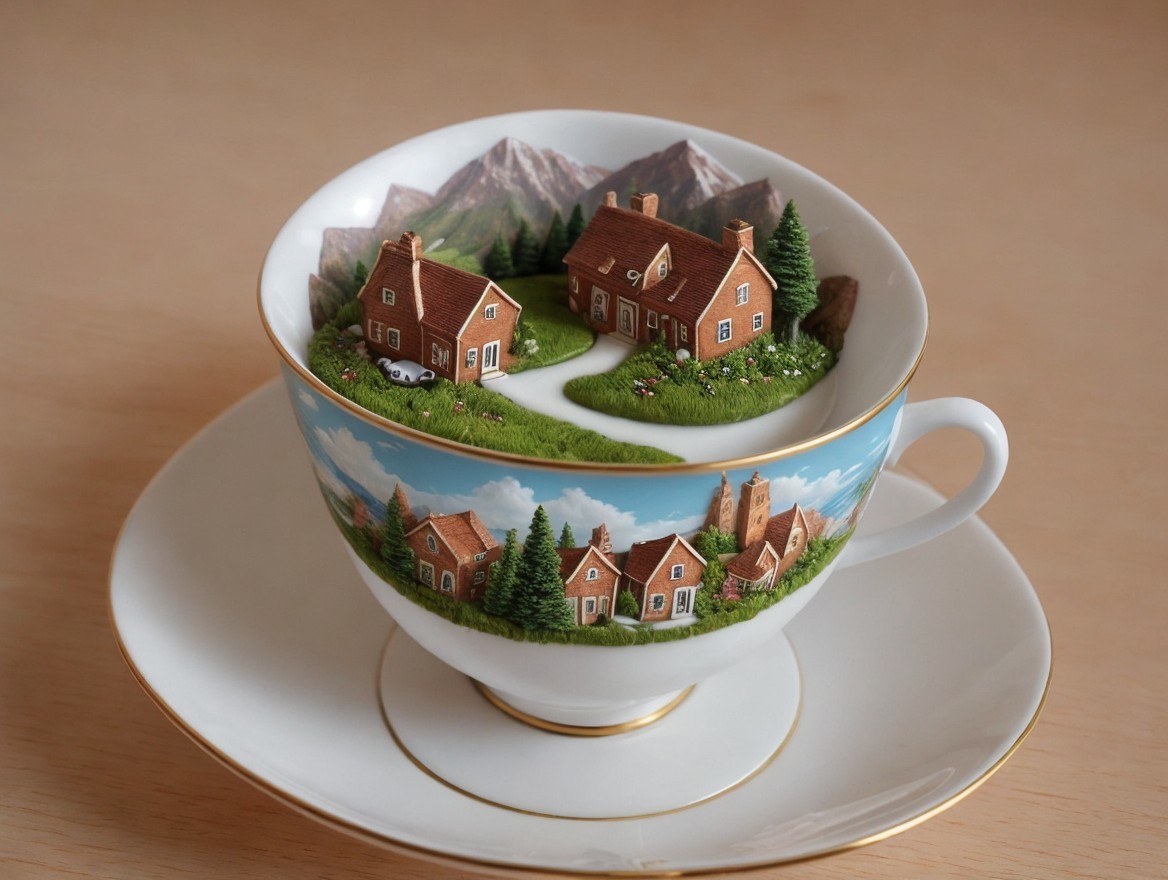 A whimsical teacup features a miniature village scene with houses, greenery, and mountains, all intricately crafted on a vibrant, detailed landscape inside the cup.