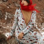 A woman sits gracefully on rocks amid stunning red rock formations. She wears a floral dress and a vibrant red headscarf, with her long red hair flowing dramatically in the wind.