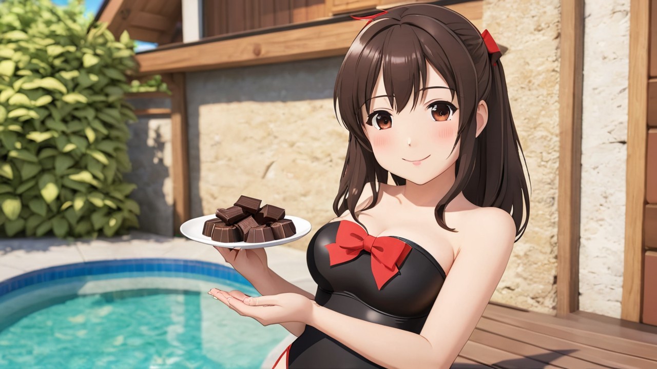 A charming anime character in a strapless swimsuit holds a plate of delectable Swiss chocolates, radiating joy and playfulness. Her vibrant colors and cheerful expression capture a delightful summer vibe.