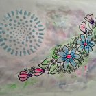 Prompt: no text,no lamp, no moon, no balls A string of floral and leaf designs is drawn with a navy tiny outline. The flowers are filled in with what appears to be watercolour, showing soft, blended colours. A circular, sunburst-like pattern of blue dots is visible on the left side of the image. intricate crystals and magical elements scattered. The combination of the whimsical floral, the soft, bleeding watercolour, and the structured dotted pattern creates a contrast between organic and geometric elements. mixed media artwork. Harmonious. Artistic flairs. Ethereal. ((A colourful and abstract Masterpiece)), ((An abstract masterpiece features a mixed-media floral art with elements of stippling or dot art set against a vibrant partially blurred backdrop of abstract colours and surreal elements, blending magical elements and nature in a stunning. Pastel and oil painting), By Joan Miró, Beksinski, Aubrey Beardsley, Catherine Abel, Paul Klee, Tomasz Setowski, Dee Nickerson, Jacek Yerka. Imperial colours. digital painting elegant fantasy bright studio setting 8k oil on canvas masterpiece very attractive beautiful award-winning fantastic view extremely detailed high-definition crisp quality colourful magical dreamy Stunning colour oil drawing