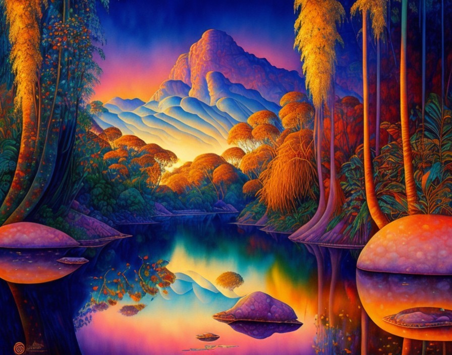 Full page, single image, 3D watercolor, fantastic Wide view, in the very best style of Gustav Klimt, a spectacular sunrise reflected in a beautiful Tingatinga style jungle river, satiny, high quality, shimmering, elegant, with vibrant spectacular colors, elegant, highly detailed, glistening magic style, by Alphonse Mucha