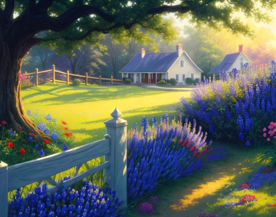 A serene image featuring an oak tree partially shading a stand of bluebonnets