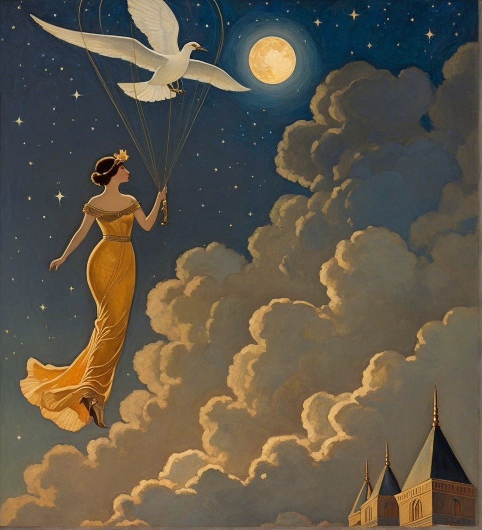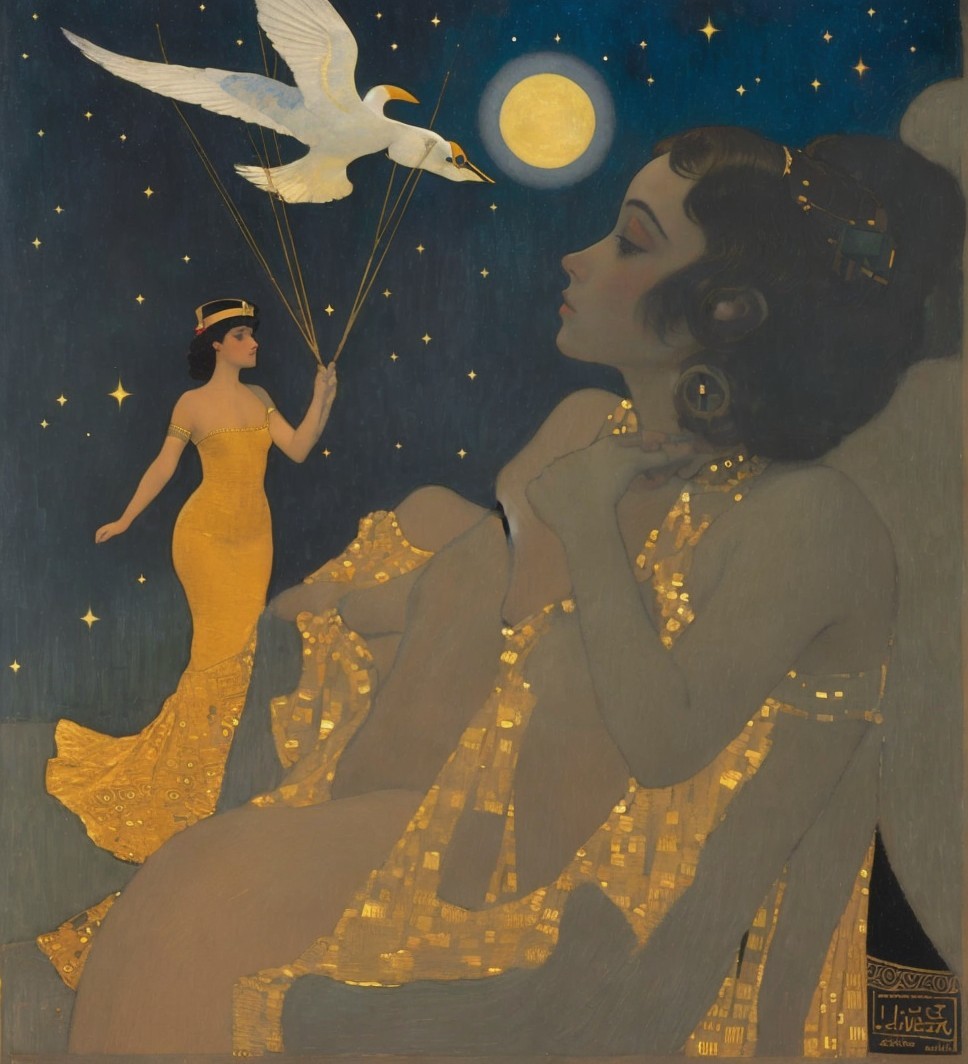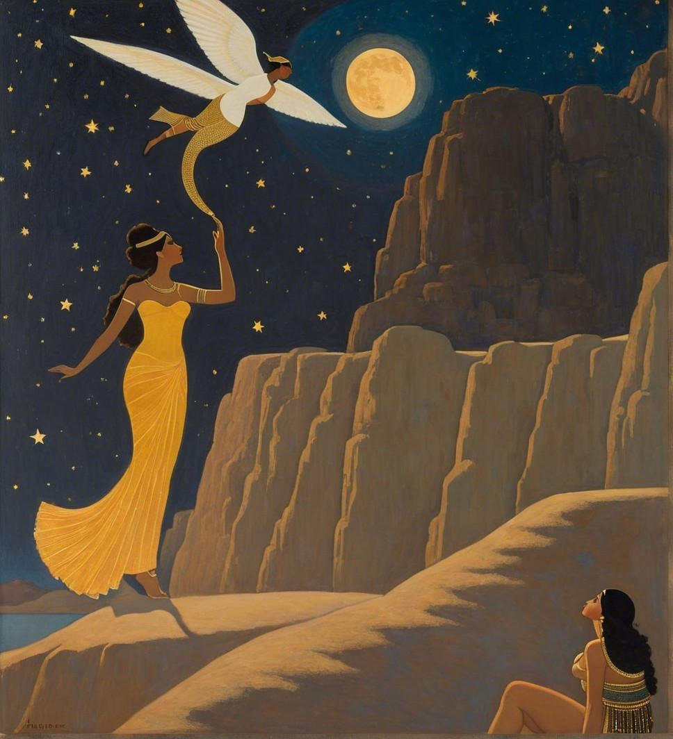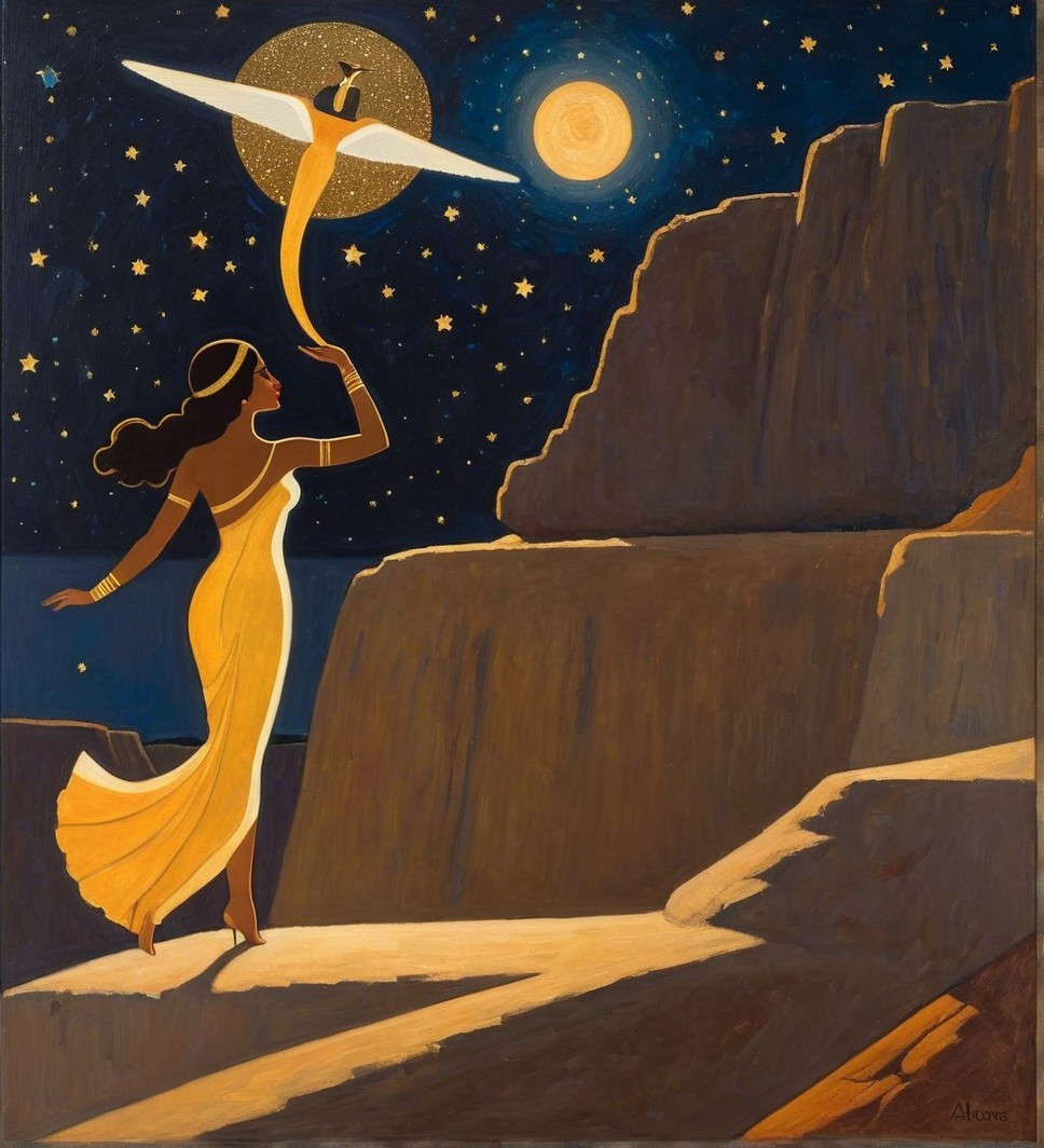 The image depicts two elegantly dressed women in golden attire against a starry night sky. One dances gracefully while the other lounges, framed by a rocky landscape and glowing celestial bodies.
