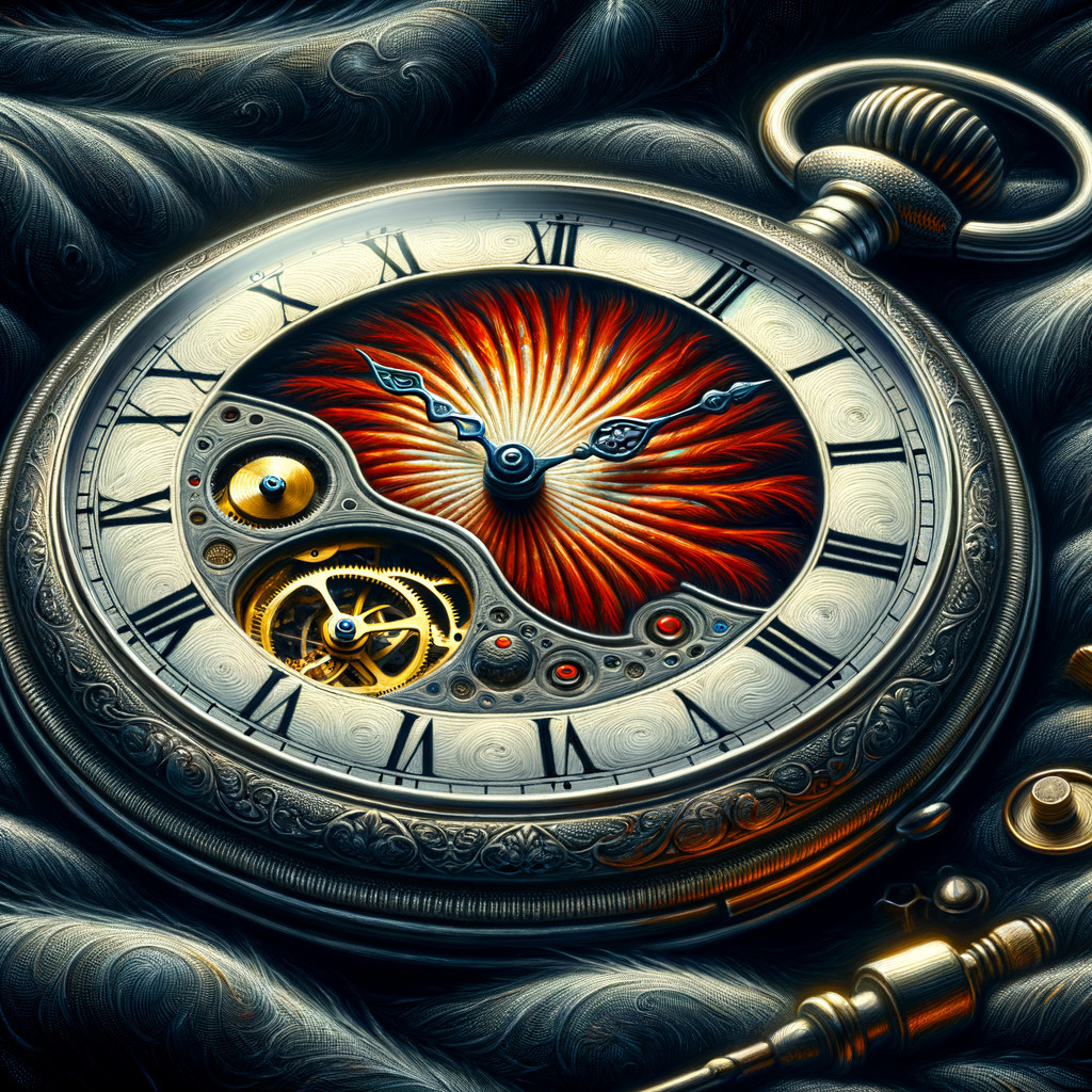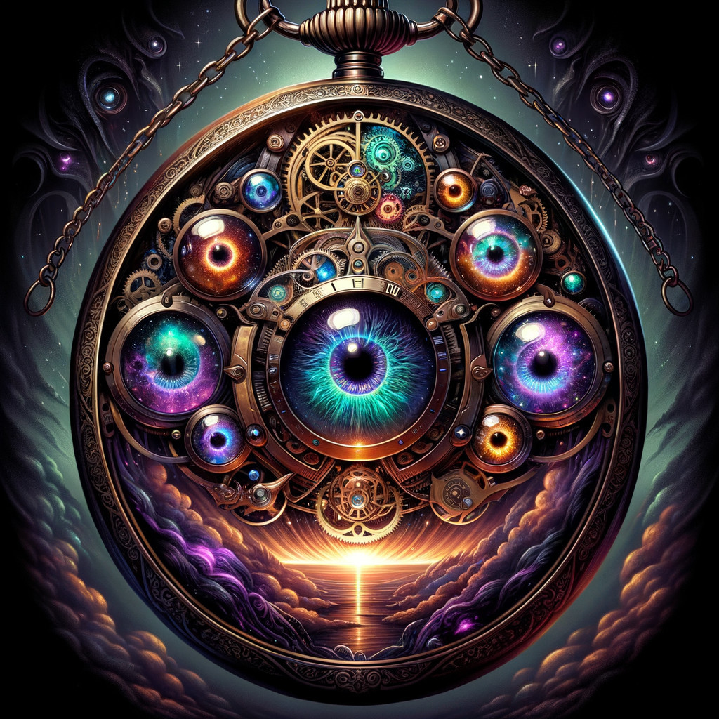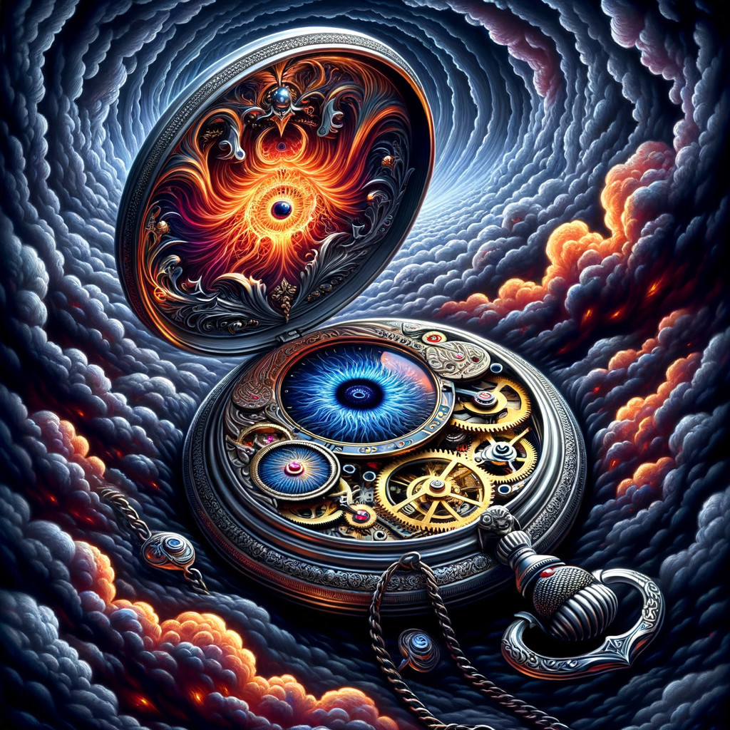 A surreal, vibrant artwork featuring a mechanical, eye-adorned orb amidst celestial clouds with chains and a radiant horizon.