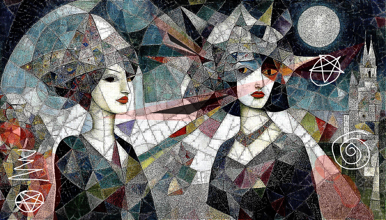 The image features two stylized women with angular faces and dramatic hats, set against a contrasting black and white background. Geometric shapes and intricate patterns create a captivating, surreal scene.