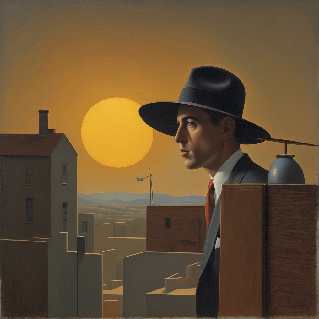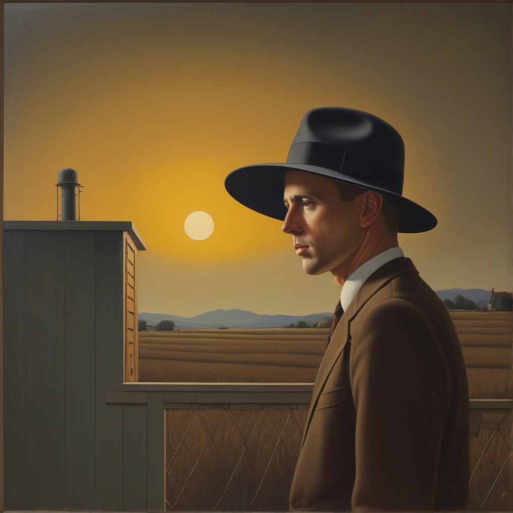 A somber man in a brown suit and wide-brimmed hat stands in a golden field, gazing towards a distant storm. An old building frames the scene, enhancing the dramatic, surreal atmosphere.