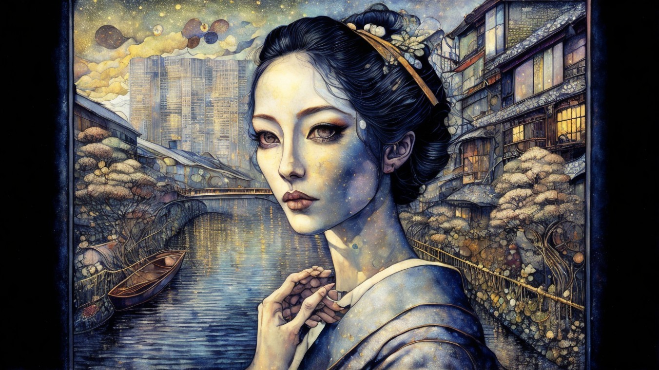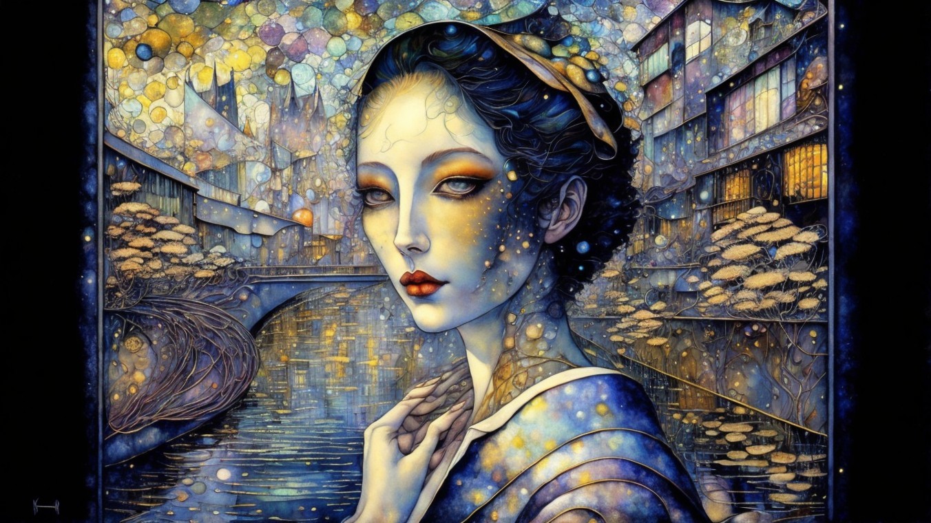 A captivating portrait of a young woman by a serene river, surrounded by quaint houses under a starry night sky. Her expression is thoughtful, adorned with a red rose and elegant jewelry.
