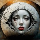 A surreal scene featuring a cracked eggshell with a serene female face emerging from it. The background showcases a desolate landscape under a dramatic sky, accentuating the ethereal atmosphere.