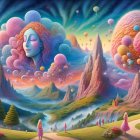 A surreal landscape features a giant, ethereal face made of colorful clouds, surrounded by vibrant hot air balloons and a winding river, set against majestic mountains and a dreamy sunset.