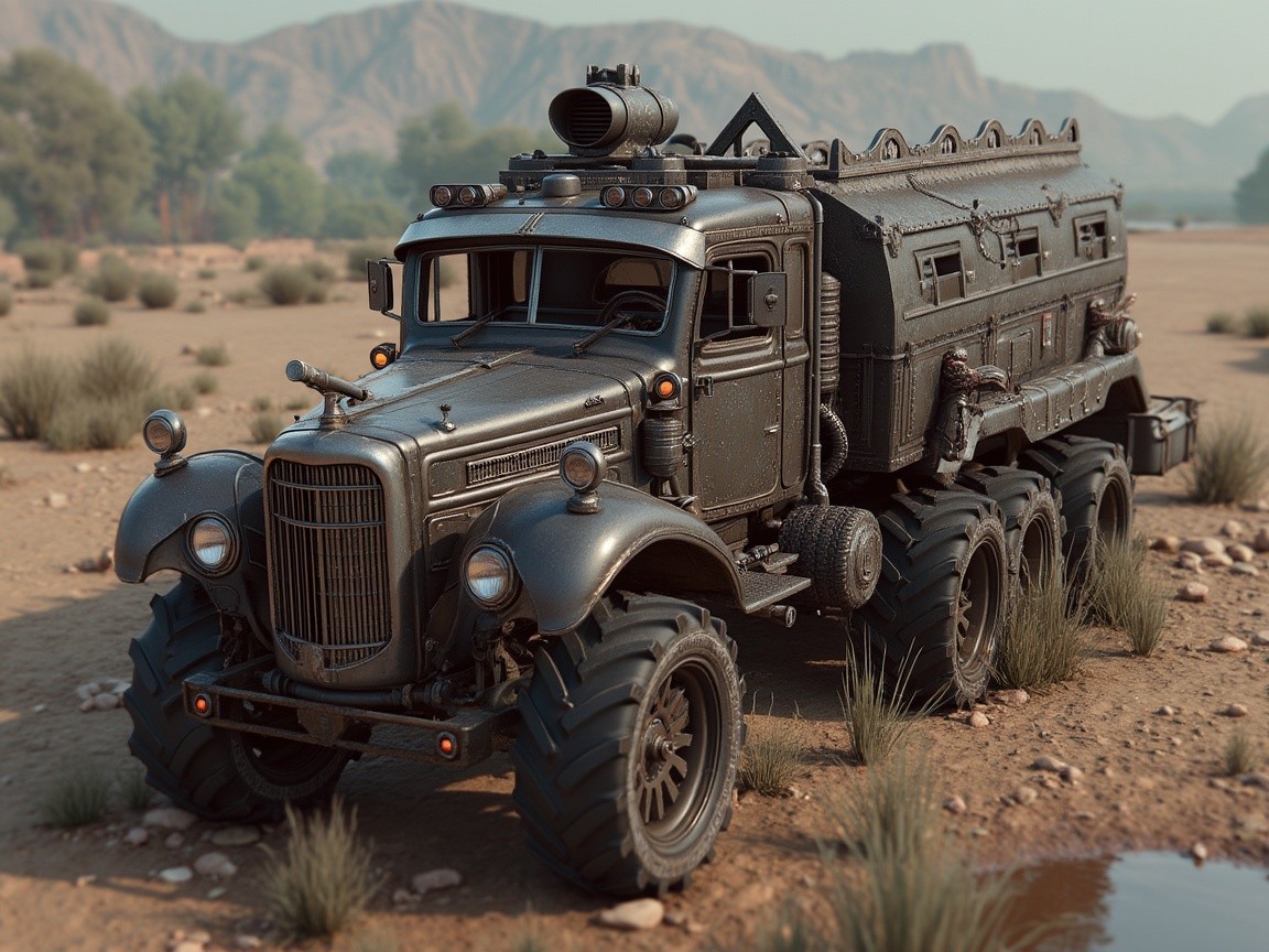 A rugged jeep with a wooden, rustic structure mounted on it, featuring a grassy roof, sits in a sandy landscape surrounded by ancient, weathered buildings and rocky formations.