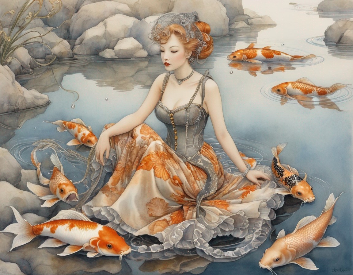 An elegant woman in traditional attire sits serenely in a pond, surrounded by vibrant koi fish, exuding a sense of peace and harmony with nature.