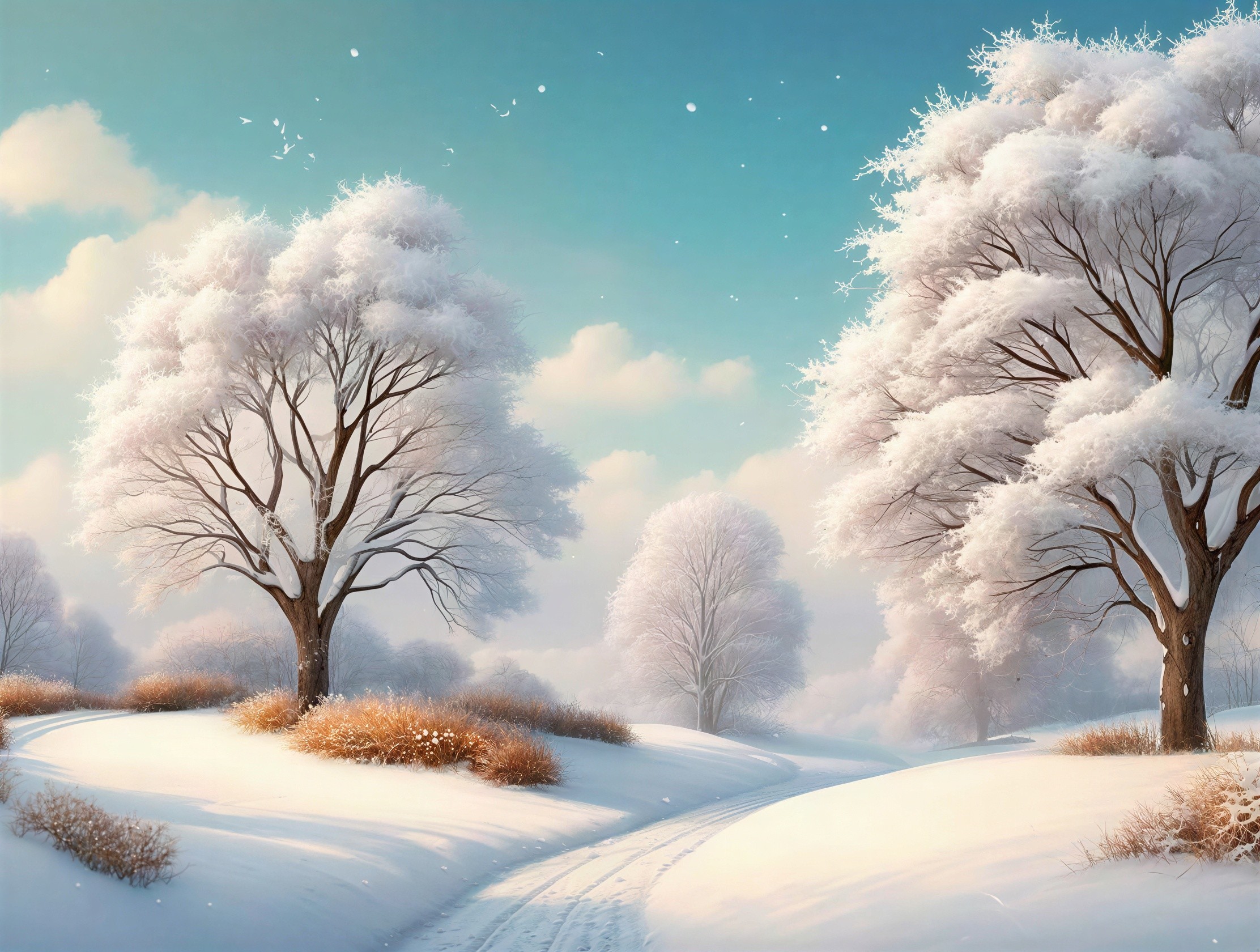 A winter wonderland scene where the sky is a pastel blue with white clouds and specs resembling snowflakes falling. A snow-covered path leads through a landscape of white trees with dark brown trunks, their branches densely covered in snow, creating a fluffy texture. Patches of dried, light brown grass and brush peek