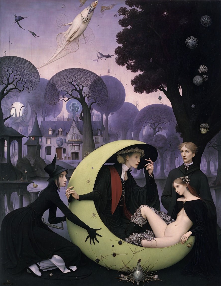A surreal painting, with people & animals around a moon boat, blending Renaissance attire & fantastical elements in a dreamlike forest.