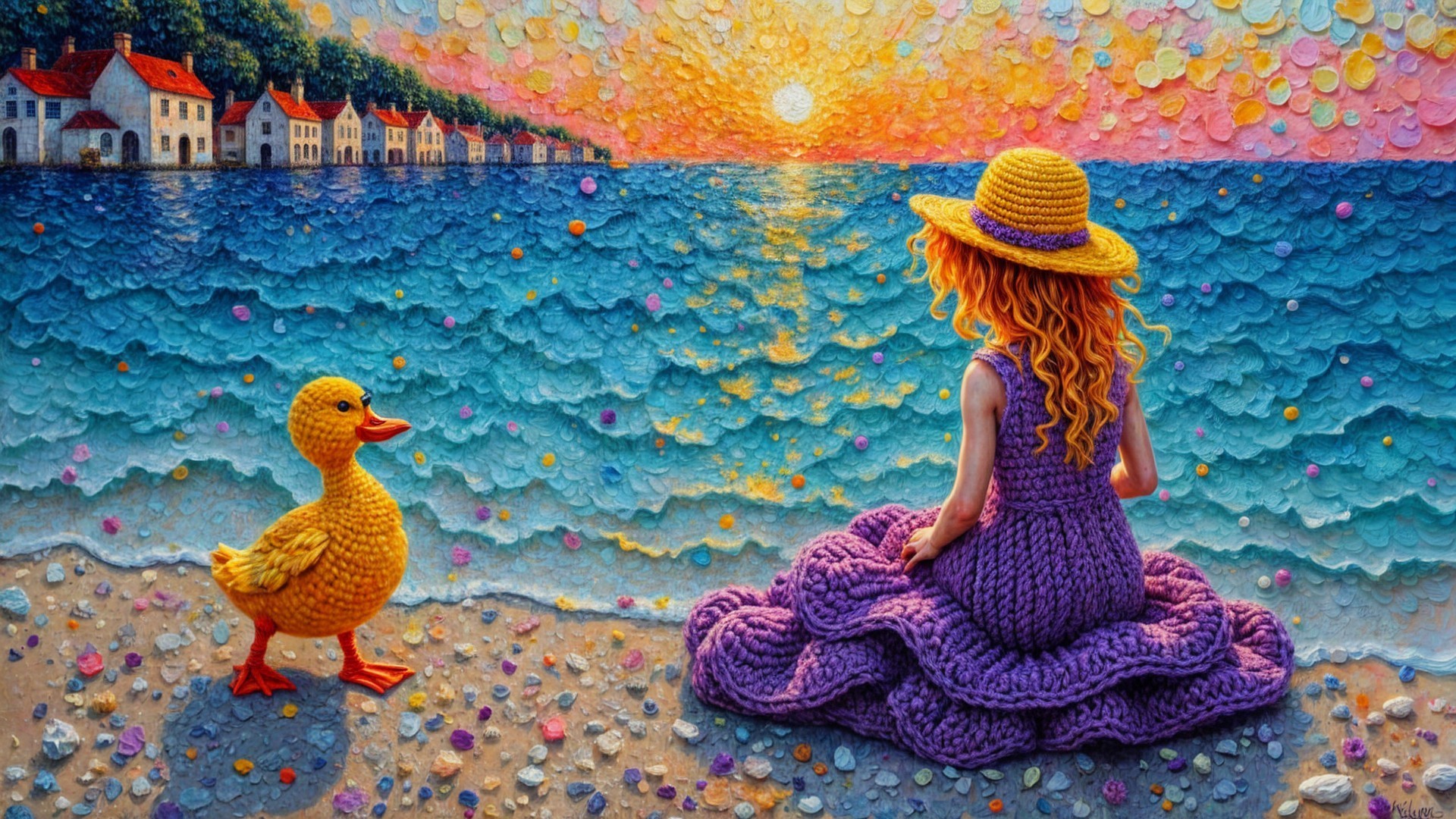 A whimsical scene shows a girl in a purple dress and yellow hat sitting by the seaside, gazing at a vibrant sunset. Beside her, a cheerful duck adds a playful touch to the serene setting.