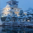 A serene winter scene features a majestic castle surrounded by snow-covered trees. The calm river reflects the beautiful architecture, bathed in soft evening light against a clear blue sky.
