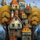 The image features a whimsical, multi-tiered house nestled among large trees, with distinctive roofs and a tower in the background, set against a bright blue sky with celestial bodies.