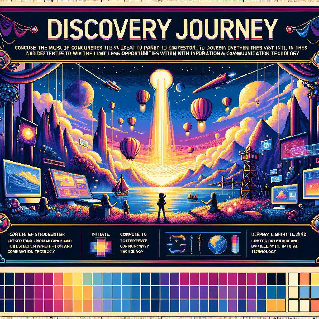Pixel art of a person standing before a towering light beam, with stylized text and design elements around the scene, evoking a retro, digital aesthetic.