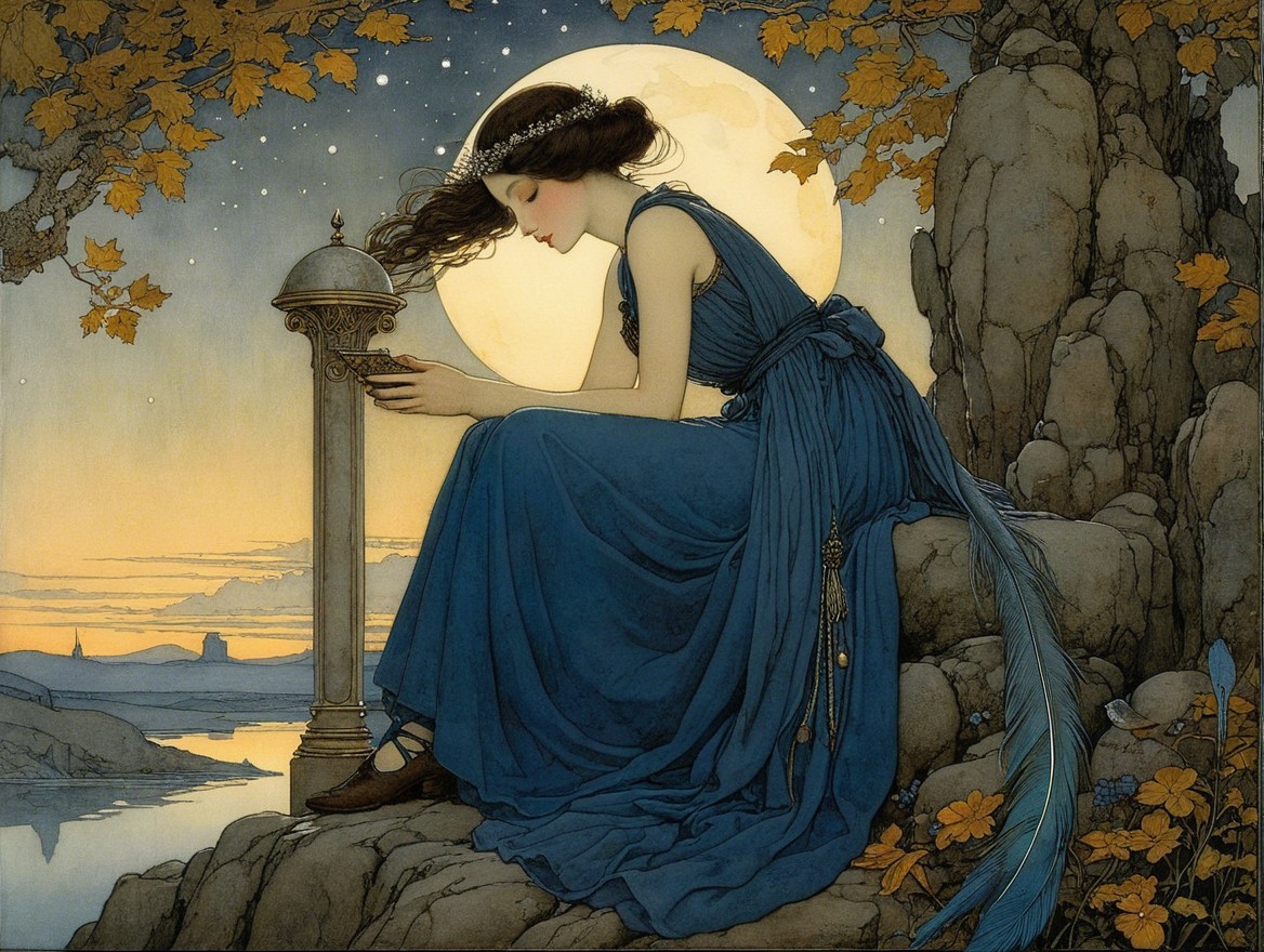 A serene young woman in a flowing blue dress sits on rocks by a moonlit lake, gazing thoughtfully. In the background, a distant castle and birds add to the enchanting, dreamlike atmosphere.