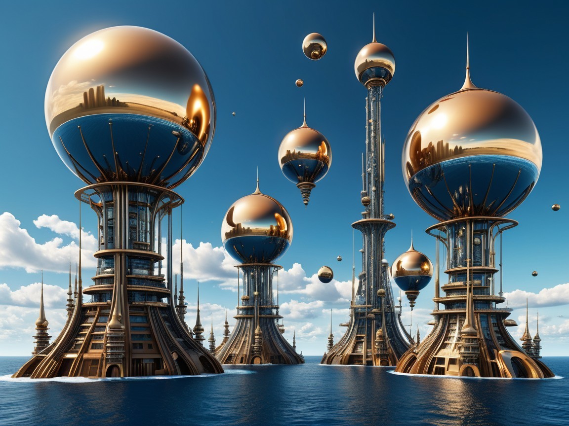 A futuristic landscape features towering structures with glossy, golden spheres hovering above them, all reflecting a clear blue sky and shimmering water, creating a surreal, otherworldly atmosphere.