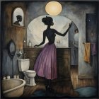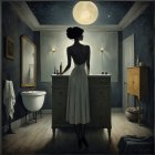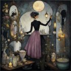 A woman in a flowing black dress stands in an arches courtyard, gazing at a full moon amidst soft clouds. The scene is gothic, with elegant buildings and a romantic, mysterious atmosphere.