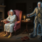 The scene depicts an elderly man in a nightgown, shocked, as a ghostly figure in chains emerges beside him. A softly glowing fireplace and a table with a bowl add a spooky atmosphere.