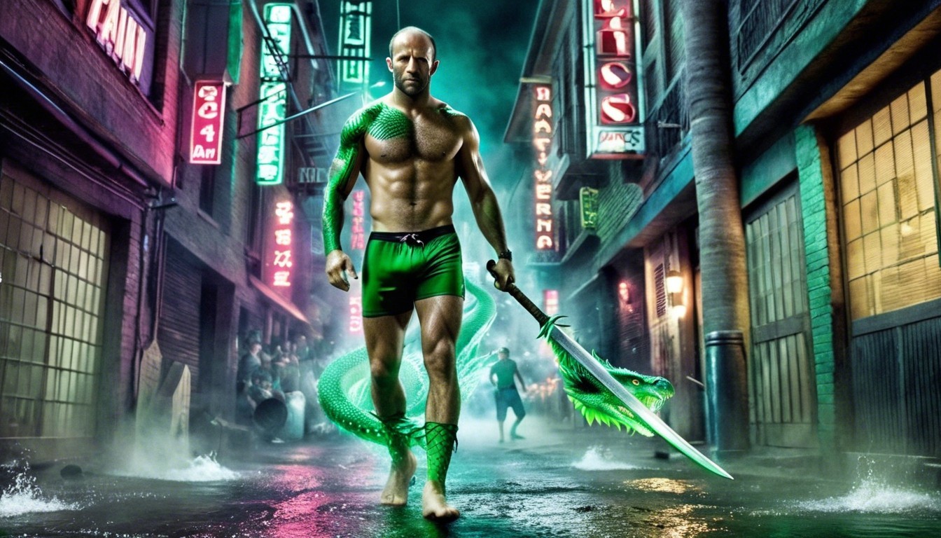 A muscular man stands in a turquoise water pool, wearing black shorts. Beside him is a green, dragon-like creature with large wings, set against a rocky backdrop and lush greenery.
