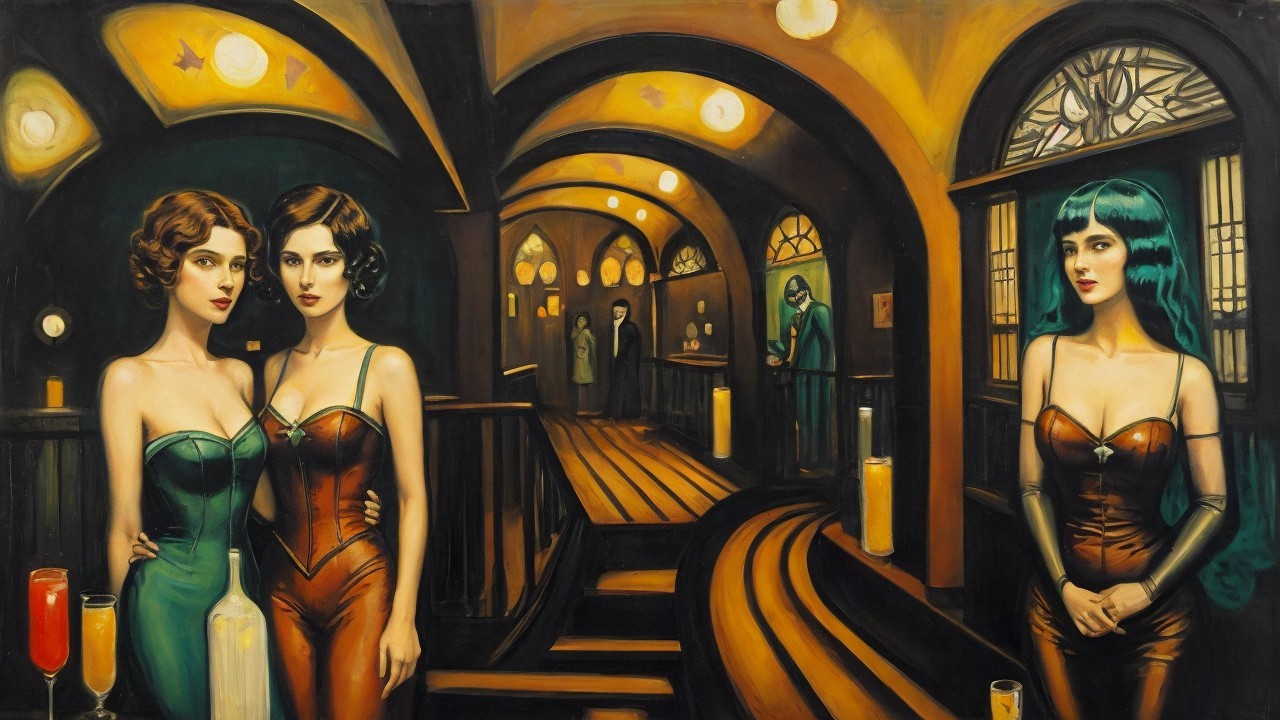 Prompt: "Art deco new romantics, in the modern nightclub Auschwitz.