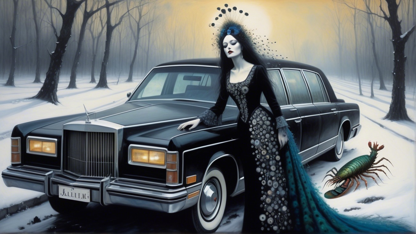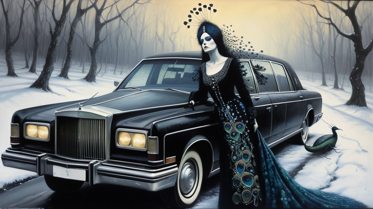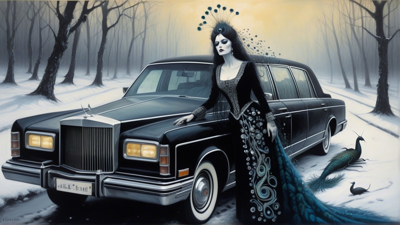 A haunting scene features a dark-haired woman in an elegant gown with peacock accents, leaning on a classic black limousine. The wintry landscape adds to the eerie, gothic atmosphere.