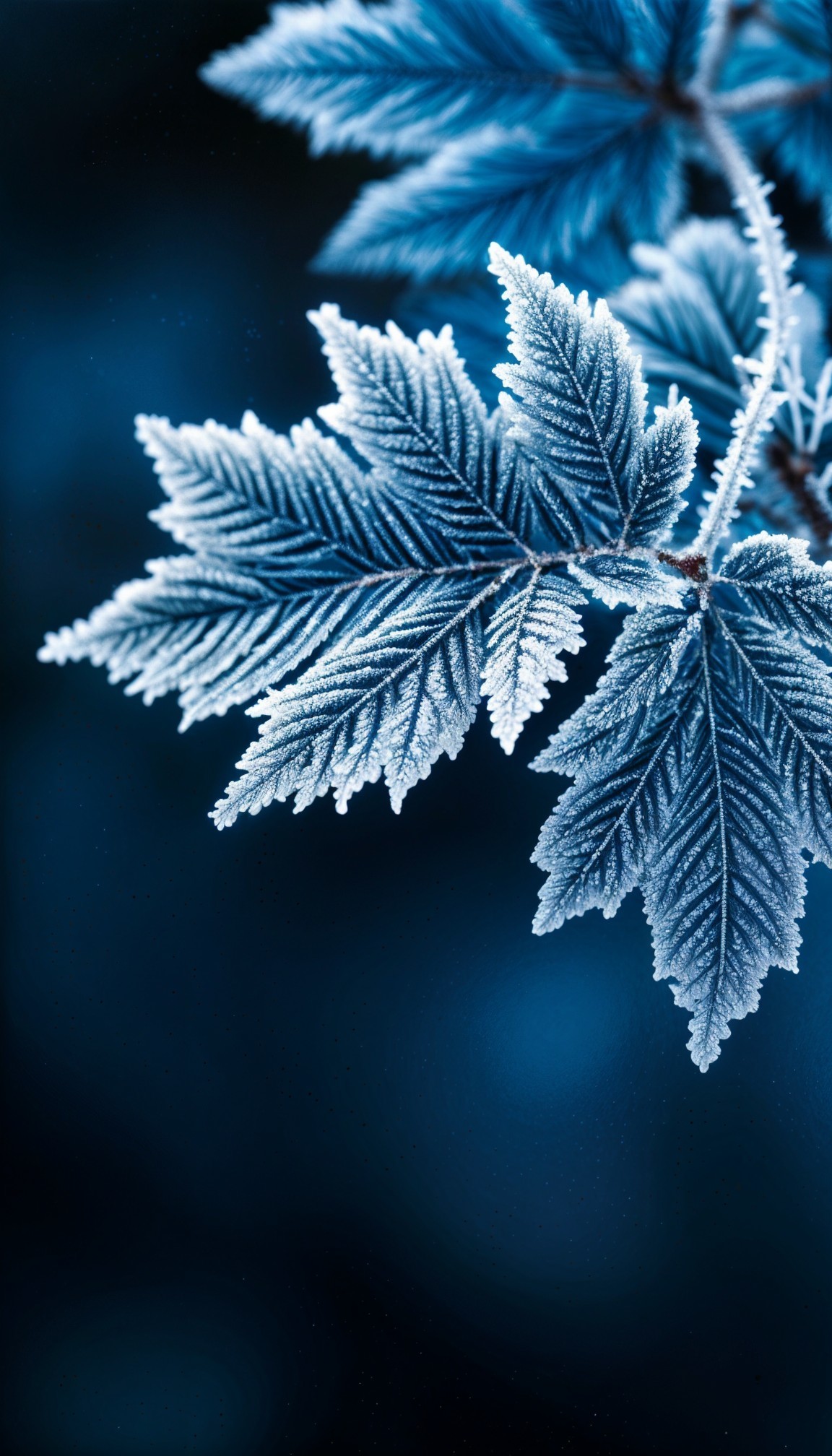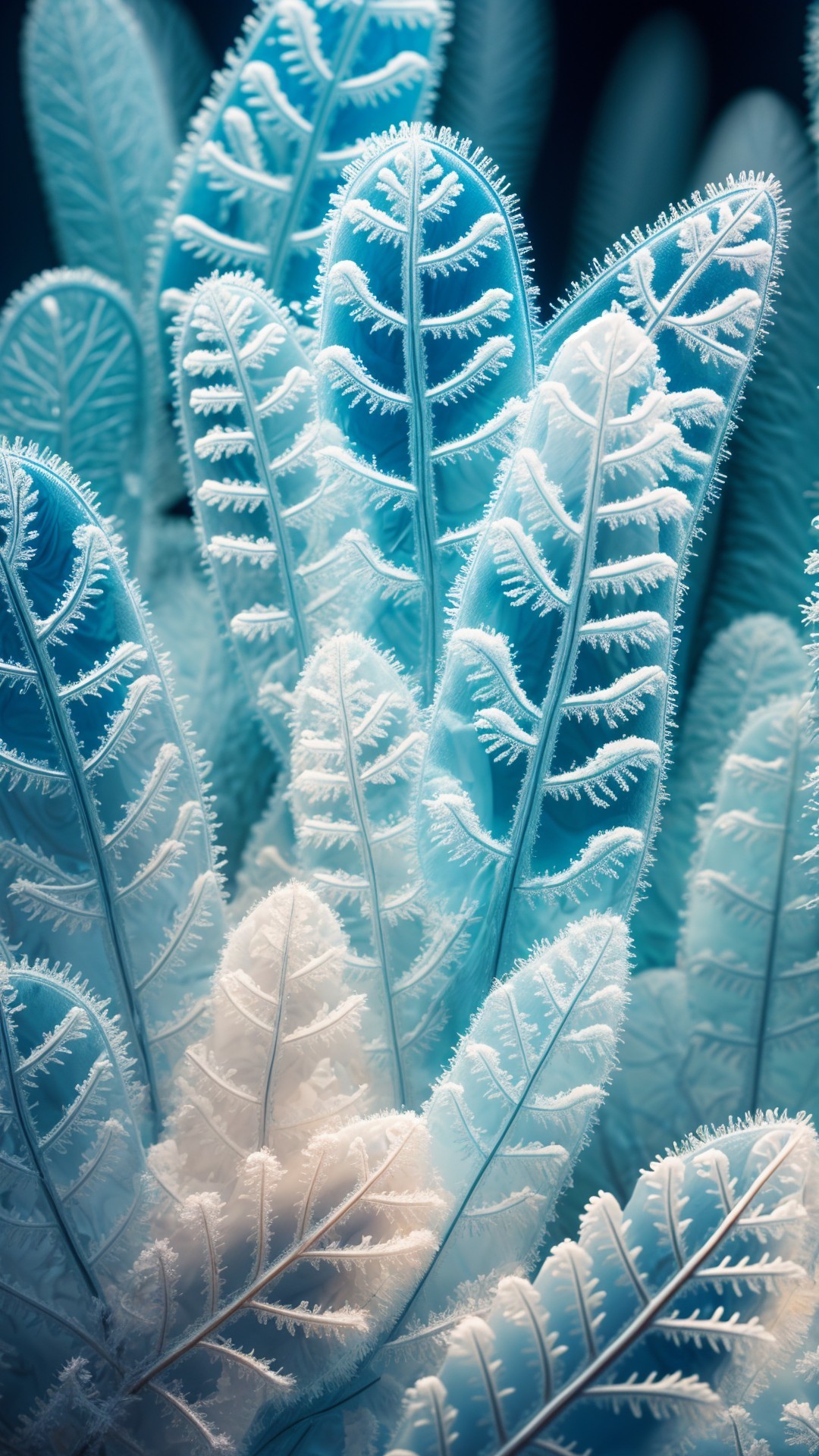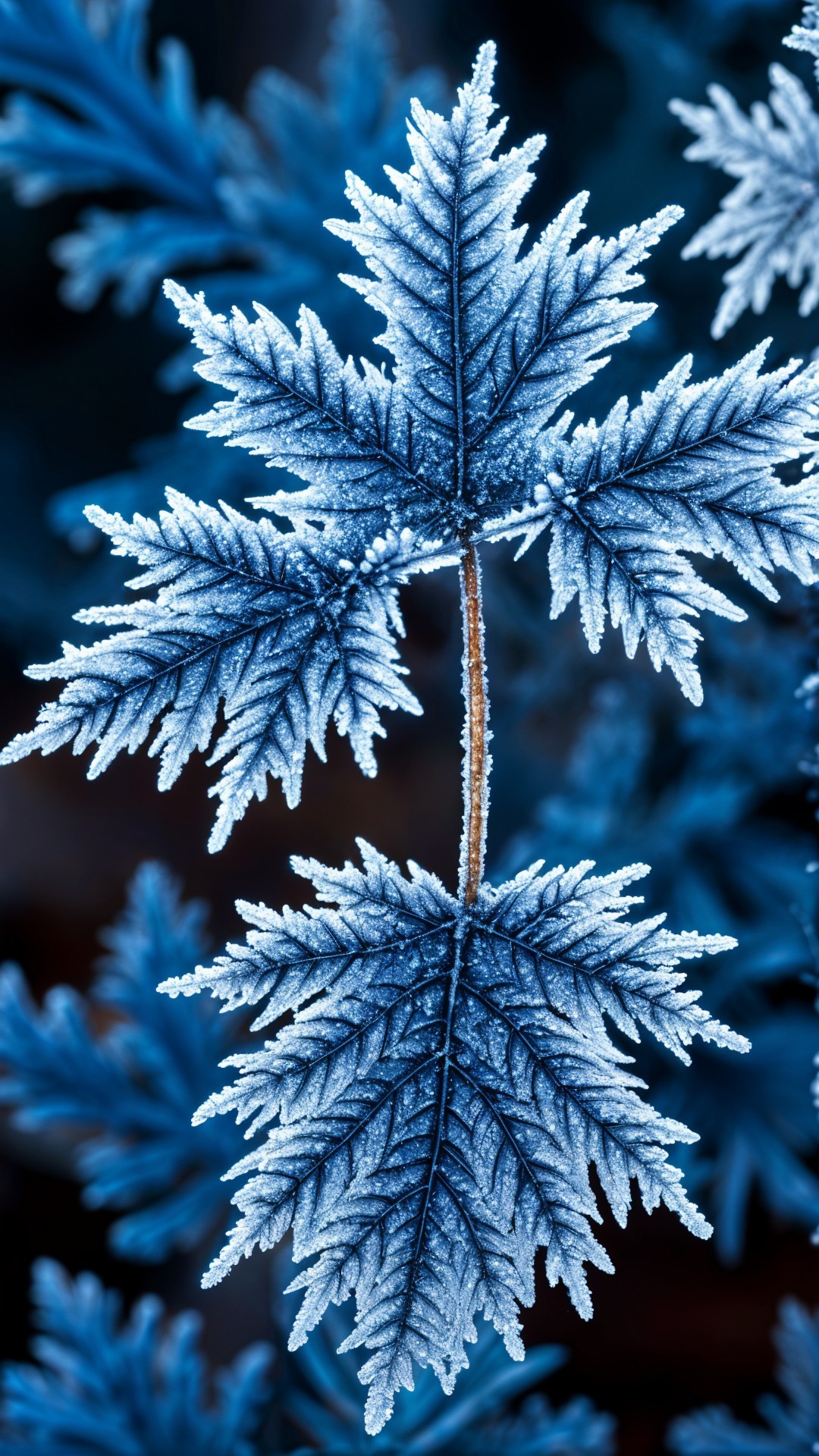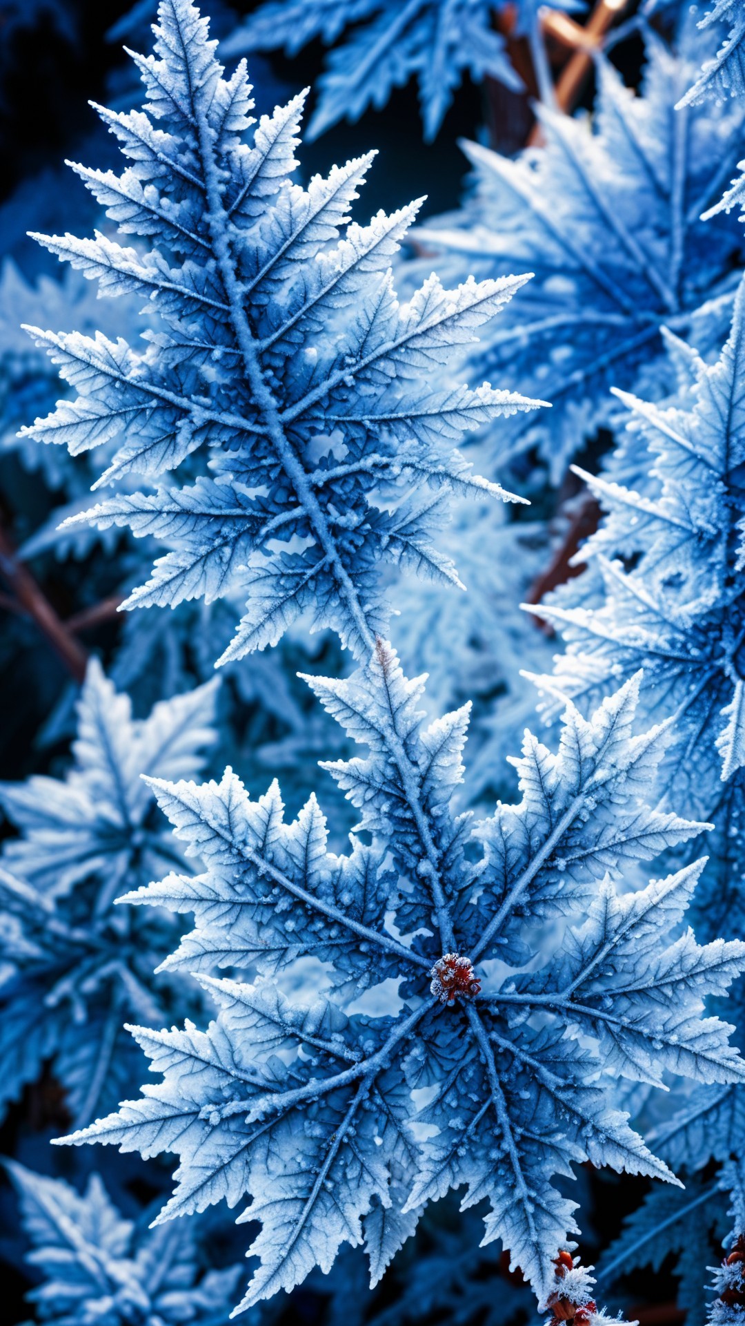 Frost-covered leaves display a stunning icy blue hue, with intricate textures and outlines. The contrasting warmth of small brown buds adds a striking detail to this wintery scene.