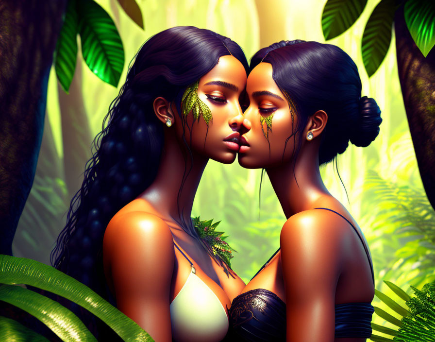 Identical animated women with dark hair and golden skin kissing in lush jungle.