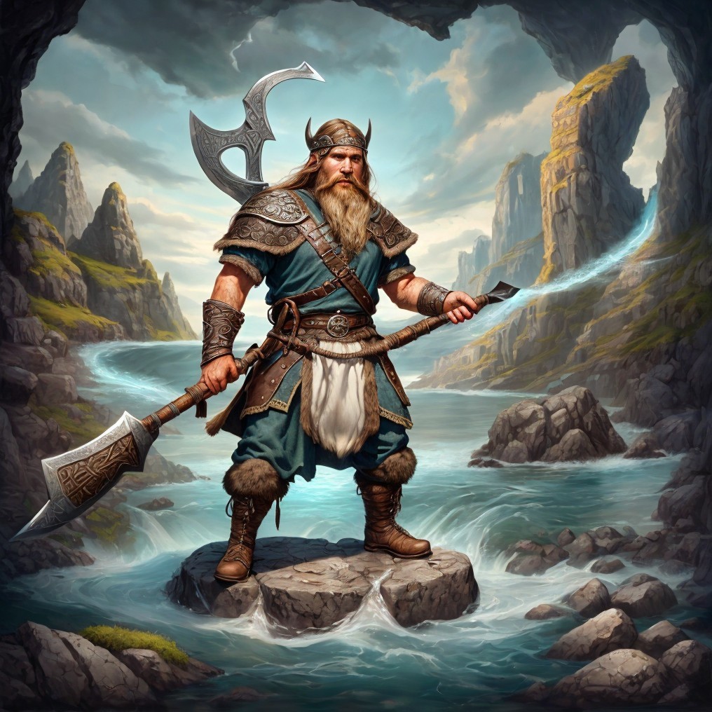 + Prompt:an illustration of a viking standing on a rock in a water vortex with an axe in his hands and a long beard, by Johan Thorn Prikker, Adventure fantasy, detailed painting, fantasy art, Artstation, record-of-ragnarok, Wall Mural