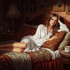 A young woman in a white dress lounges on a richly decorated bed, surrounded by cozy pillows. Soft light highlights her thoughtful expression, with vintage portraits and books in the background.