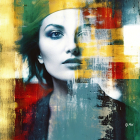 A vibrant, colorful portrait of a woman with flowing hair, surrounded by bold patterns and floral designs. The background features sunny landscapes and abstract shapes, creating a lively atmosphere.
