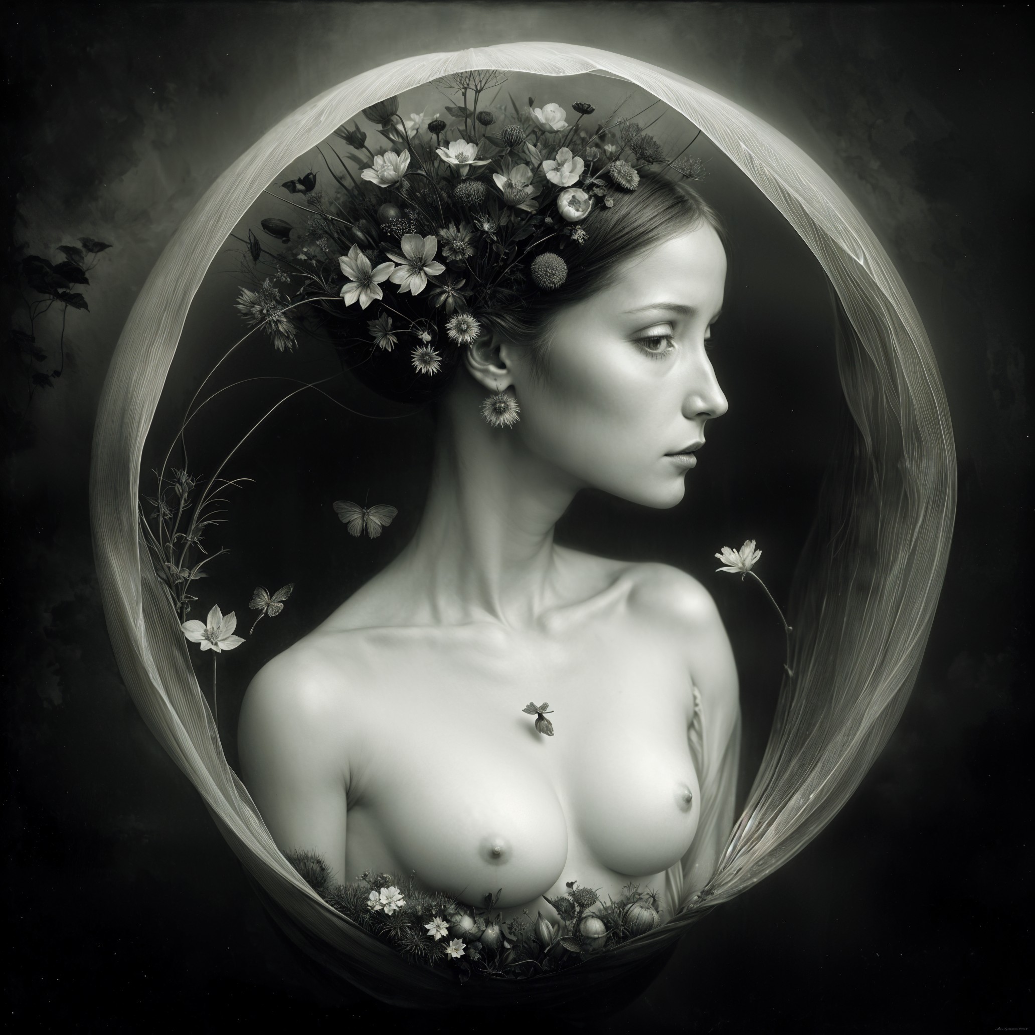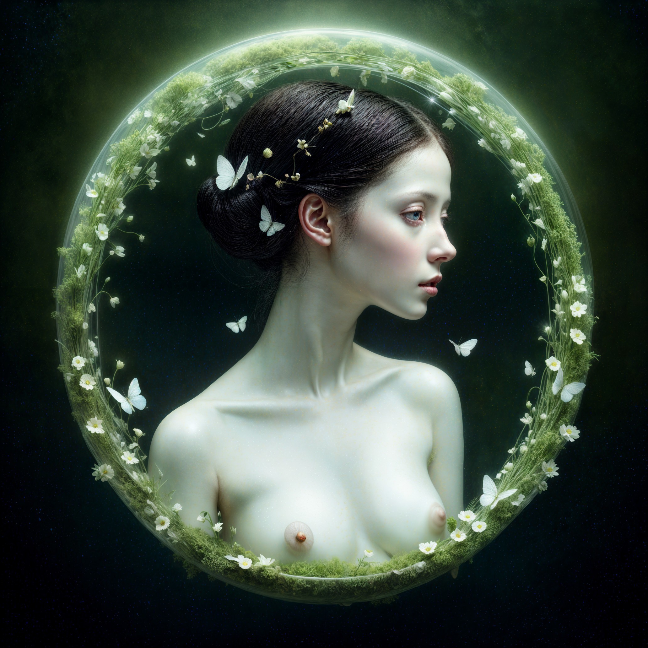 A serene portrait of a woman partially enclosed in a glass dome, surrounded by delicate flowers and greenery, exuding a sense of tranquility and connection with nature.