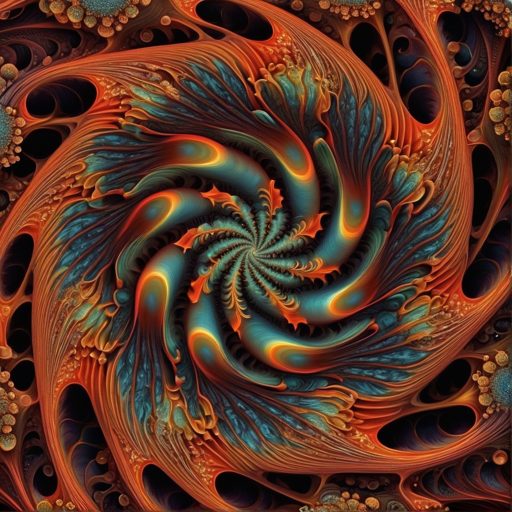 This image features a vibrant, spiraling fractal design, showcasing intricate patterns in warm hues of orange and cool tones of blue, resembling a mesmerizing shell or galaxy form.