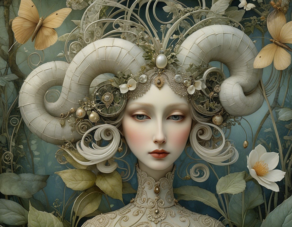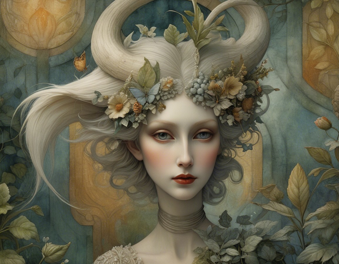 A fantastical figure with elegant features, adorned with horns and a floral crown, surrounded by lush greenery. The serene gaze and intricate details evoke a mystical, enchanting aura.