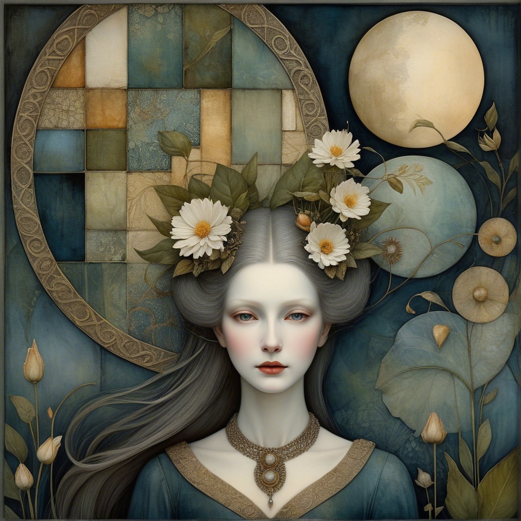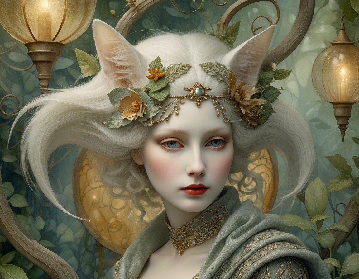 + Prompt:Close up, impish beautiful white-faced creature in a garden wonderland labyrinth, in the style of Wolfe von lenkiewicz. by Catrin Welz-Stein, Michael Parkes 3d, extremely detailed, beautiful, watercolor and ink, mixed media, Best quality, Very high definition, super clear resolution, cinematic, intricate, fantastic view, beautiful, dynamic lighting, high definition, hdr *Random prompt award winning Max Ernst ultra detailed, 4K 3D, Texture