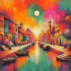 A vibrant landscape showcases a winding river flanked by blooming lavender fields and cypress trees, with colorful cottages under a striking sunset sky of orange, pink, and purple hues.