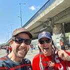 The image features two smiling men wearing sunglasses, posing closely for a selfie. They are surrounded by a vibrant, colorful abstract background, creating a joyful and festive atmosphere.