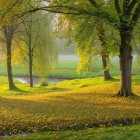 A tranquil scene of a misty morning in a meadow, featuring lush green grass and trees with vibrant yellow and green leaves. Soft sunlight filters through the fog, creating a serene atmosphere.