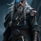 A powerful Odin, the All-Father with long silver hair and a braided beard wears intricate armor. He has a striking blue eye and carries symbolic accessories, set against a dark, mystical background.