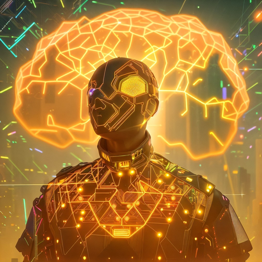 A futuristic cyborg with a sleek, illuminated design stands against a backdrop of glowing neural patterns, showcasing a blend of technology and artificial intelligence.